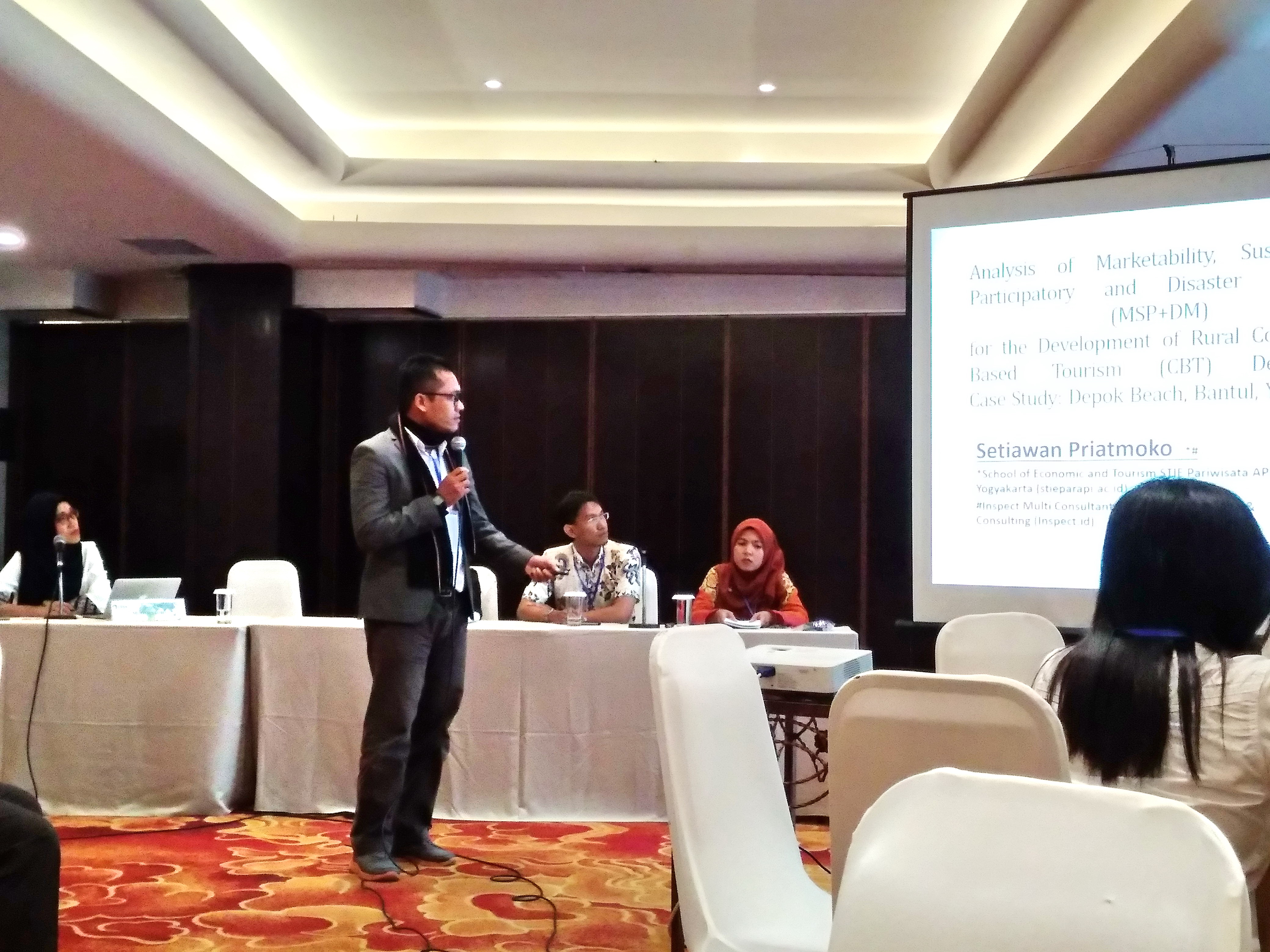 Pada kesempatan itu, Setiawan Priatmoko, S.E., M.M. sebagai dosen STIE Pariwisata API Yogyakarta memaparkan metode pengganti analisis SWOT dalam pengembangan pariwisata berbasis masyarakat. Seperti diketahui bersama, kebangkitan pariwisata berbasis masyarakat di Indonesia telah menjadi fenomena di Tanah Air. Penggunaan analisis yang sederahana namun komprehensif sangat dibutuhkan oleh para pemangku kepentingan agar pembuatan kebijakan maupun pengembangan dapat lebih diaplikasikan oleh para pelaku pariwisata. Penelitian yang dilakukan untuk memformulasikan analisis MSP+DM tersebut dilakukan di kawasan Pantai Depok, Pantai Baru, Desa Kebon Agung, dan kawasan Goa Selarong Kabupaten Bantul Daerah istimmewa Yogyakarta.