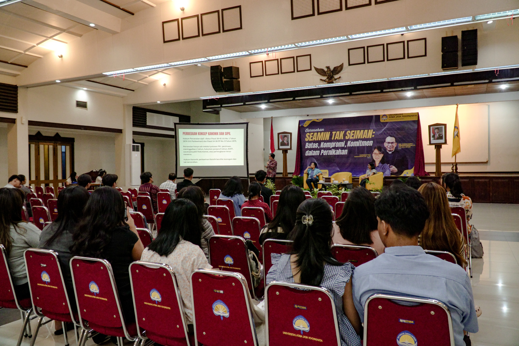 Universitas Atma Jaya Yogyakarta (UAJY) melalui Campus Ministry bekerja sama dengan Mata Kuliah Pengembangan Kepribadian (MPK) menyelenggarakan sarasehan bertajuk “Seamin Tak Seiman: Batas, Kompromi, atau Komitmen dalam Pernikahan” pada Kamis (12/3) di Auditorium Kampus II Gedung St. Thomas Aquinas. Kegiatan yang terbuka untuk umum ini menghadirkan dua narasumber, yakni Rm. Thomas Surya Awangga Budiono, SJ dan Puspaningtyas Panglipurjati, S.H., LL.M.