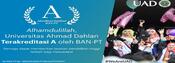 Akreditasi yang diperoleh UAD sesuai dengan SK dari Badan Akreditasi Nasional Perguruan Tinggi (BAN-PT) Nomor 3632/SK/BAN-PT/Akred/PT/2017 Akreditasi Institusi Perguruan Tinggi (AIPT). (ard)