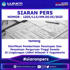 Siaran Pers Nomor 1205/LL5/HM.00.05/2023 KLARIFIKASI PEMBERITAAN PENUTUPAN DAN PENYATUAN PERGURUAN TINGGI SWASTA DI LINGKUNGAN LLDIKTI WILAYAH V YOGYAKARTA ...